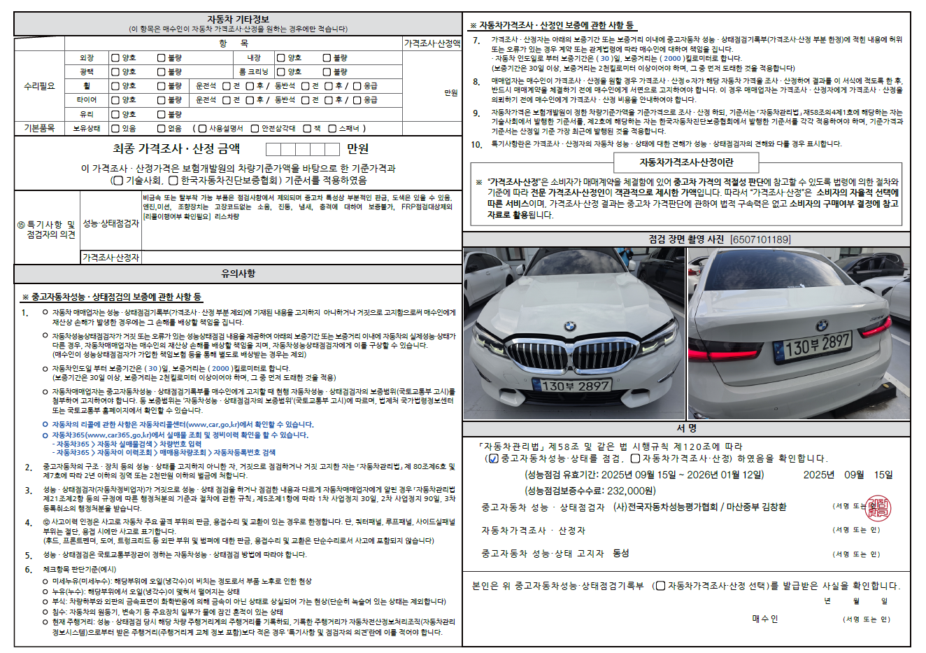 중고자동차 성능 · 상태 점검기록부