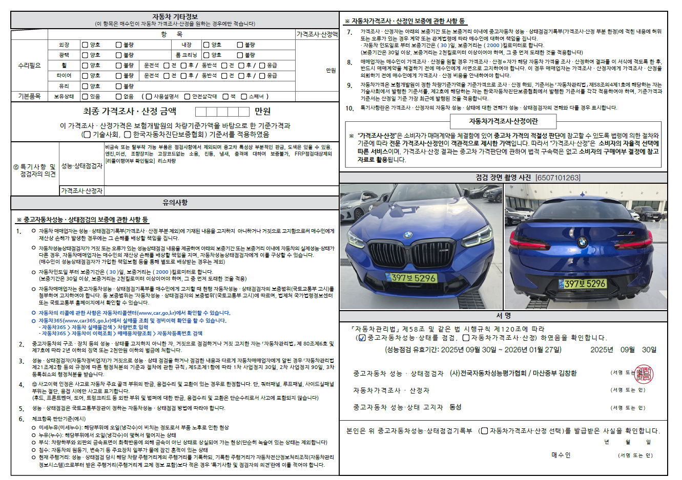 중고자동차 성능 · 상태 점검기록부