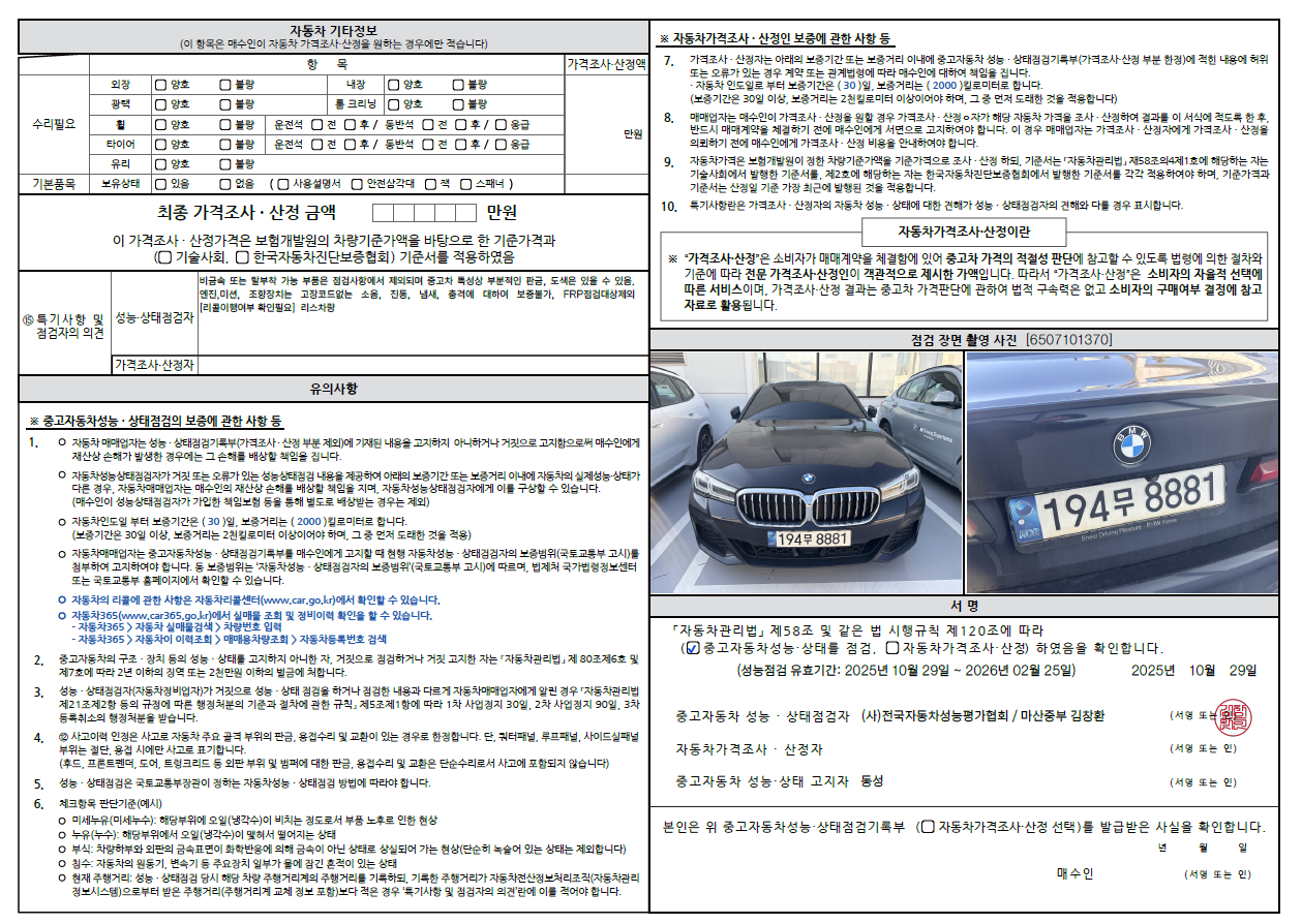 중고자동차 성능 · 상태 점검기록부