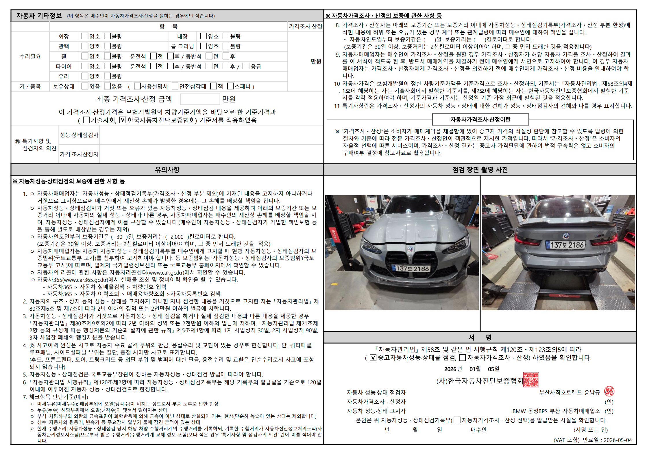 중고자동차 성능 · 상태 점검기록부