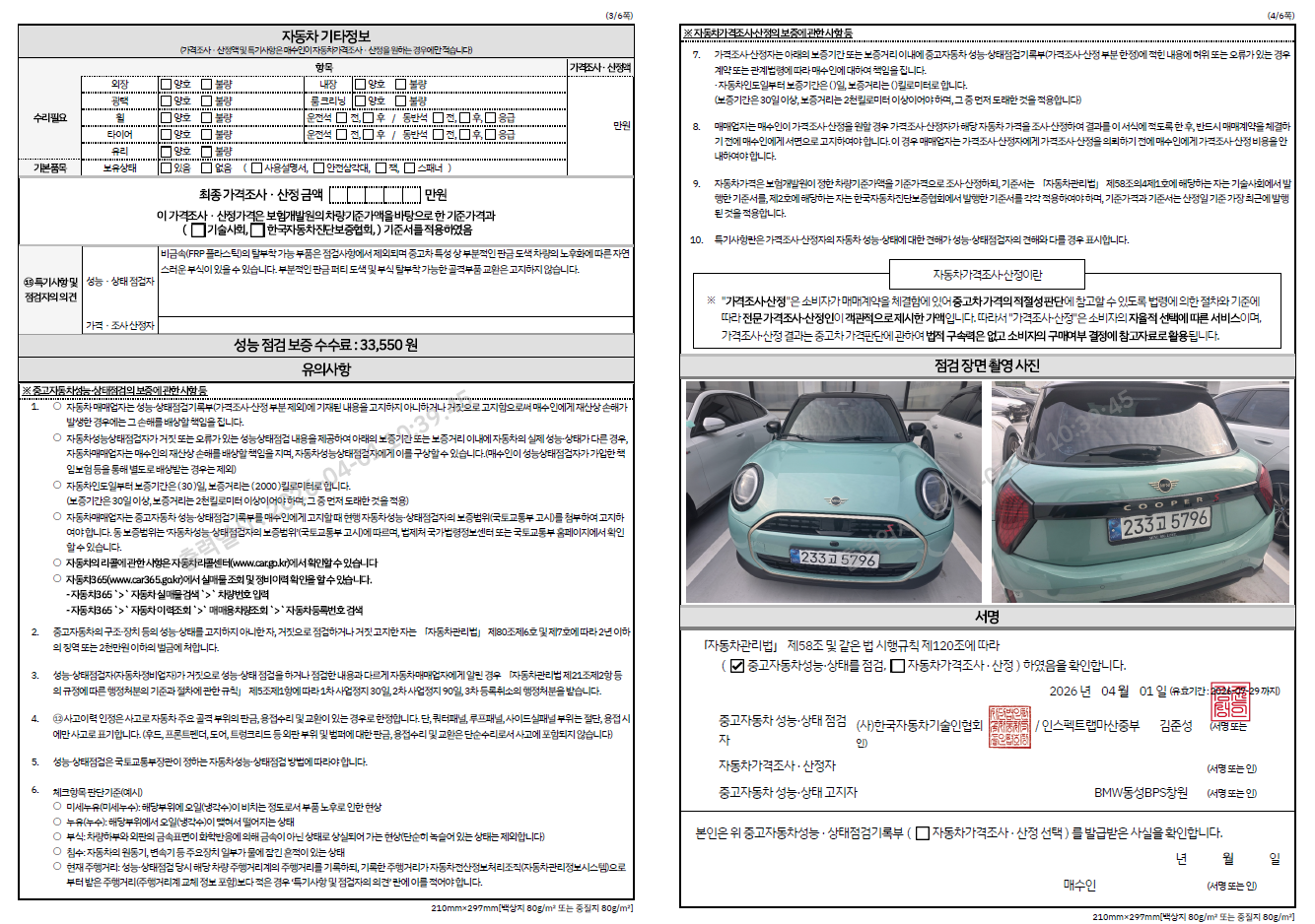 중고자동차 성능 · 상태 점검기록부
