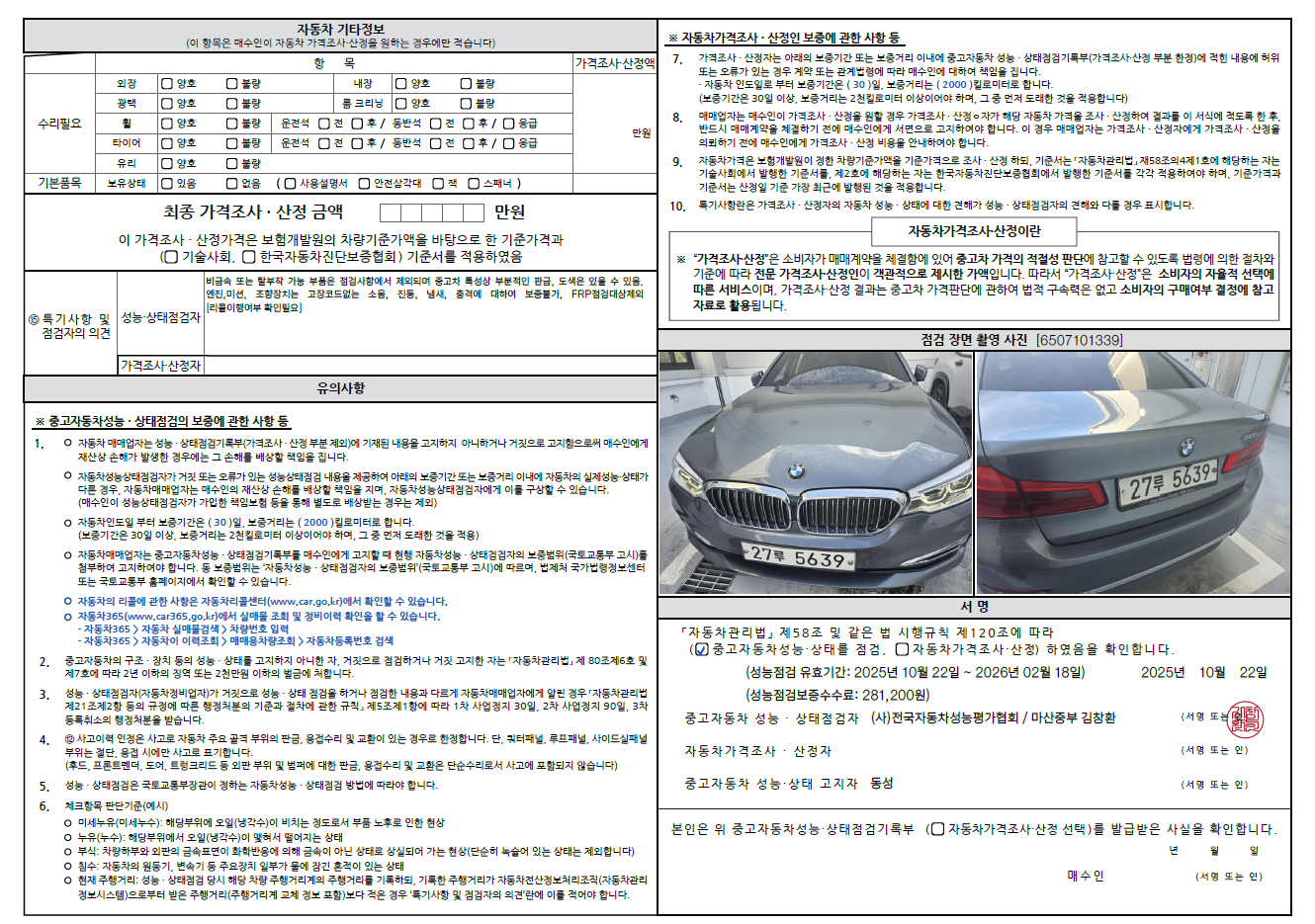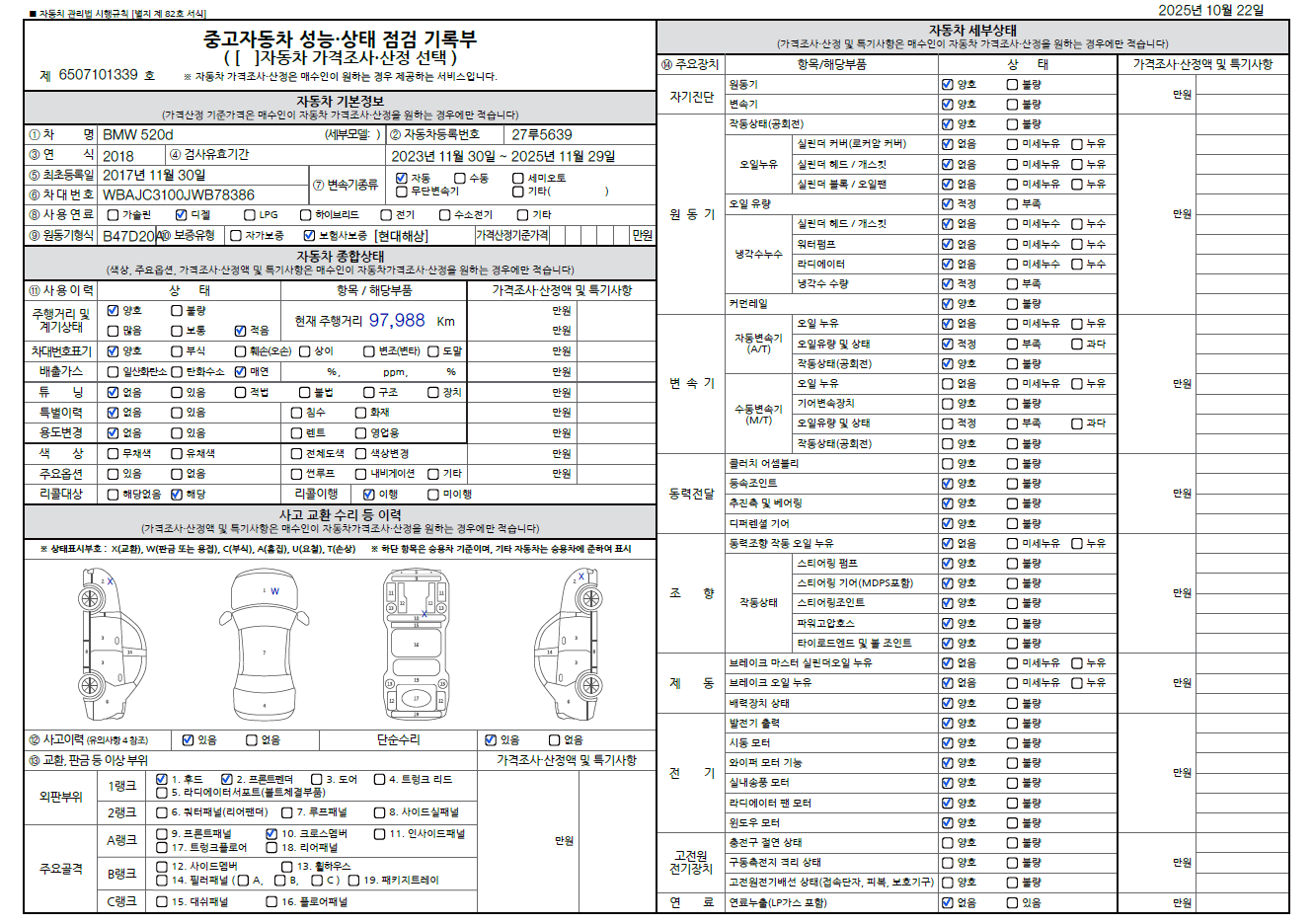 중고자동차 성능 · 상태 점검기록부