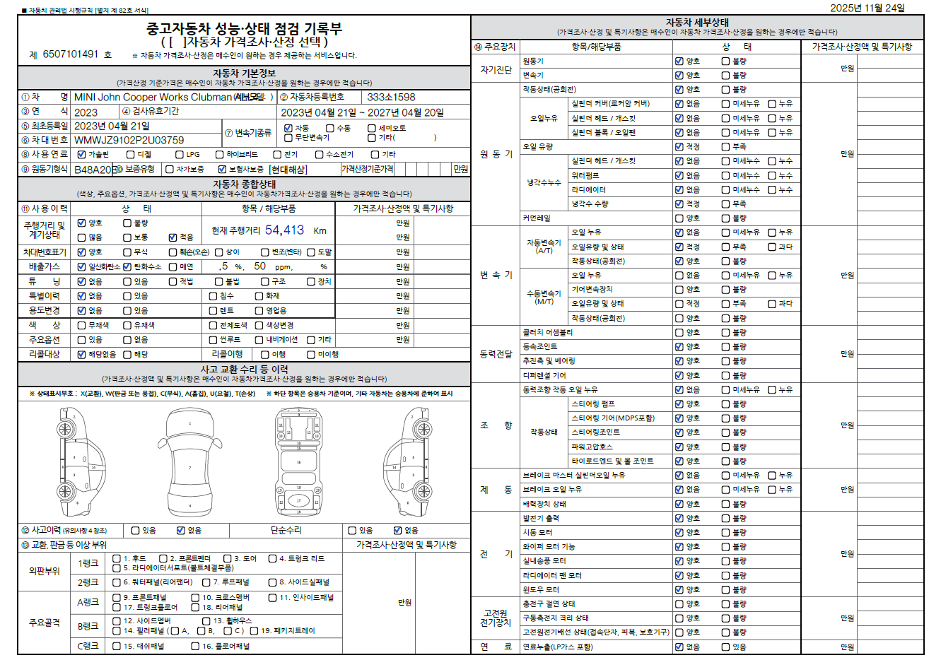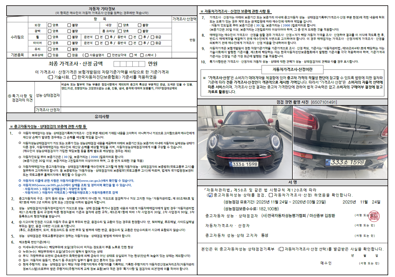중고자동차 성능 · 상태 점검기록부