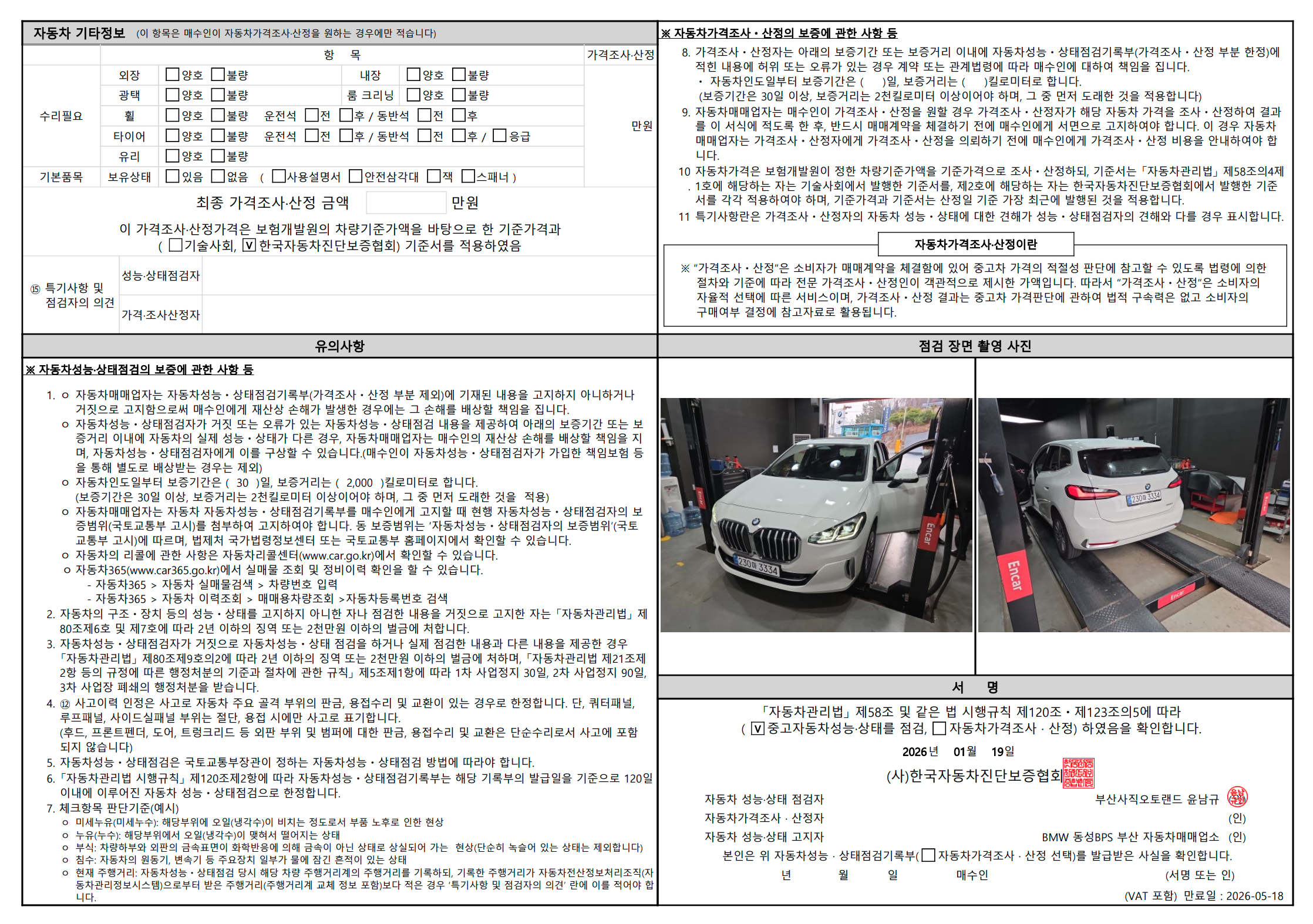 중고자동차 성능 · 상태 점검기록부