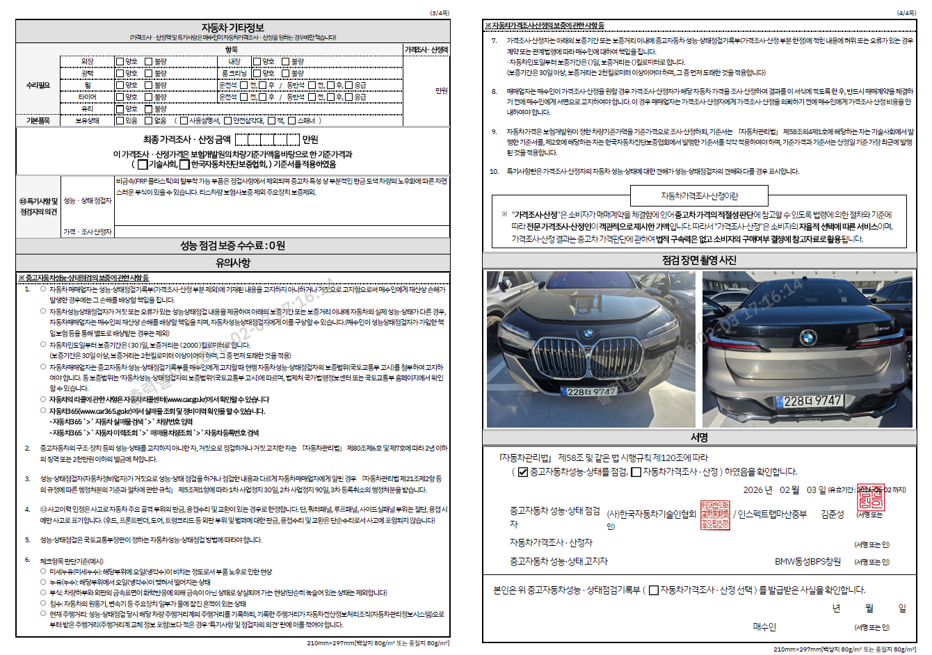 중고자동차 성능 · 상태 점검기록부