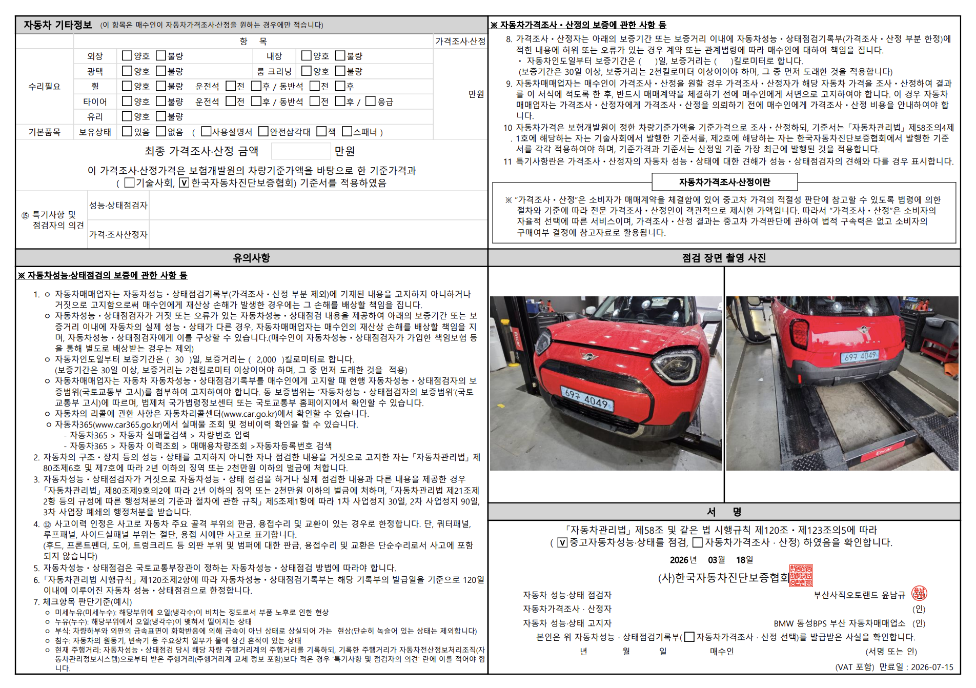 중고자동차 성능 · 상태 점검기록부