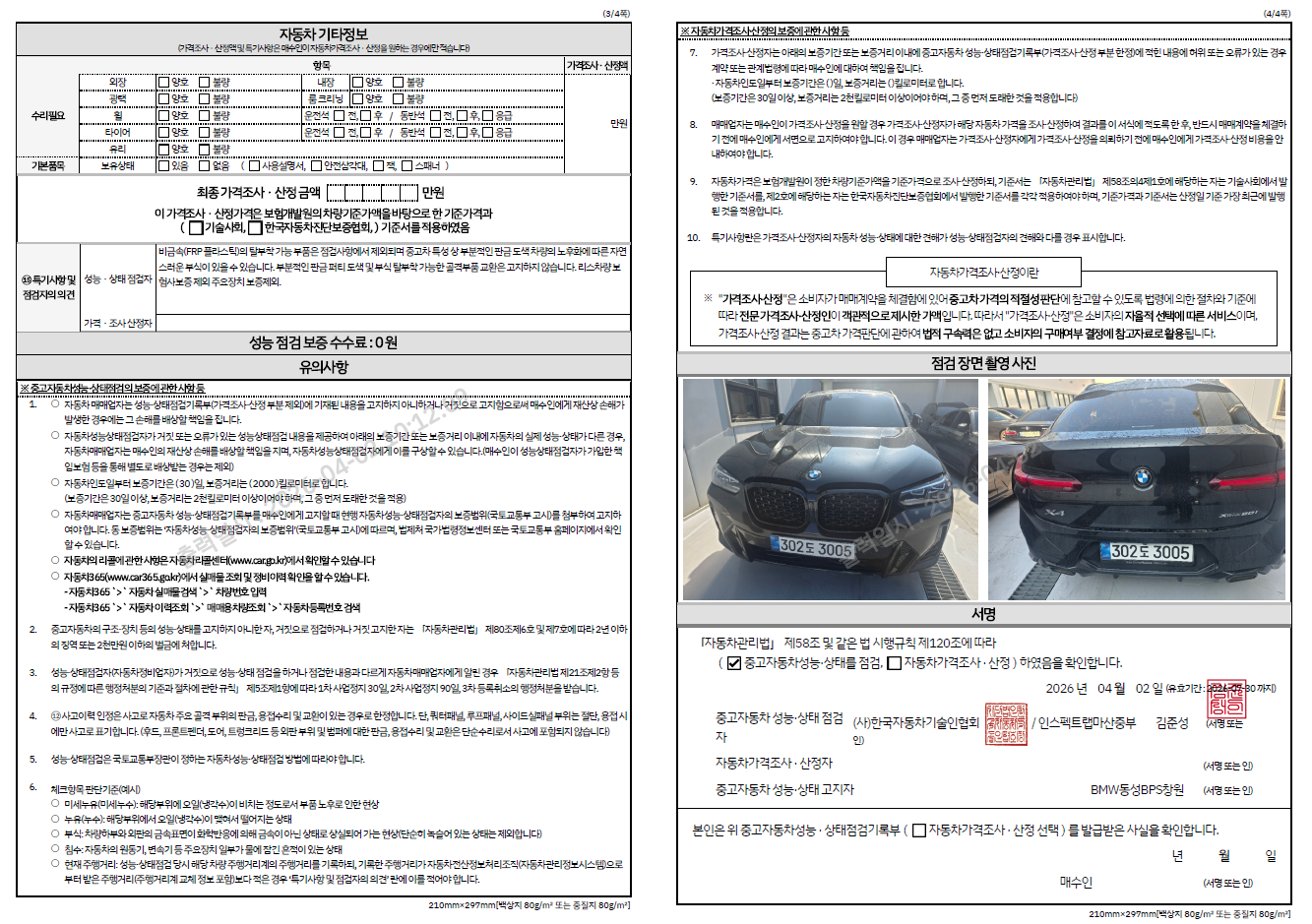중고자동차 성능 · 상태 점검기록부