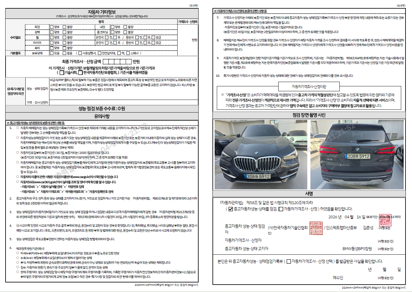 중고자동차 성능 · 상태 점검기록부