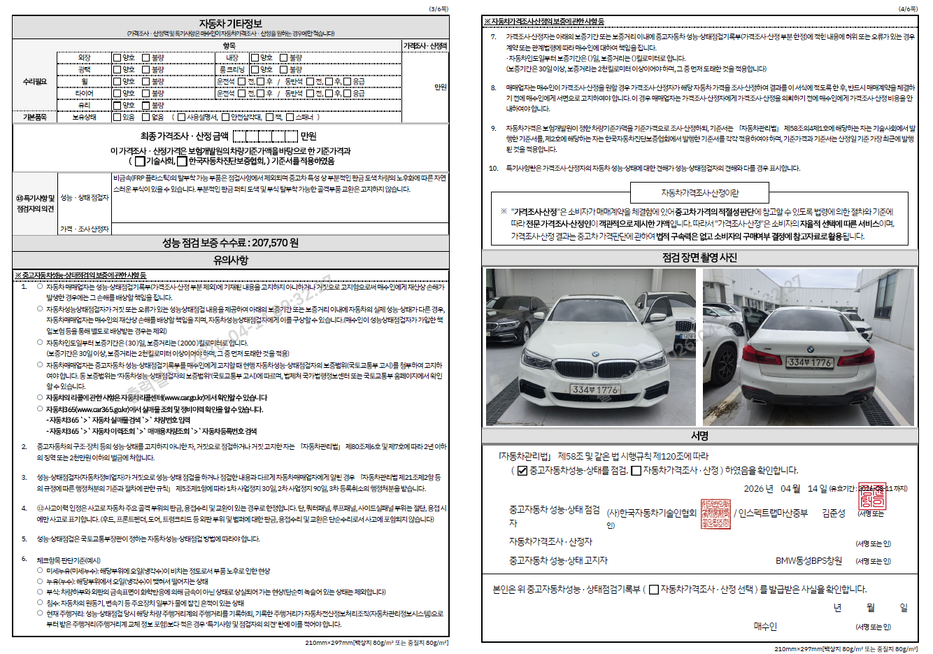 중고자동차 성능 · 상태 점검기록부