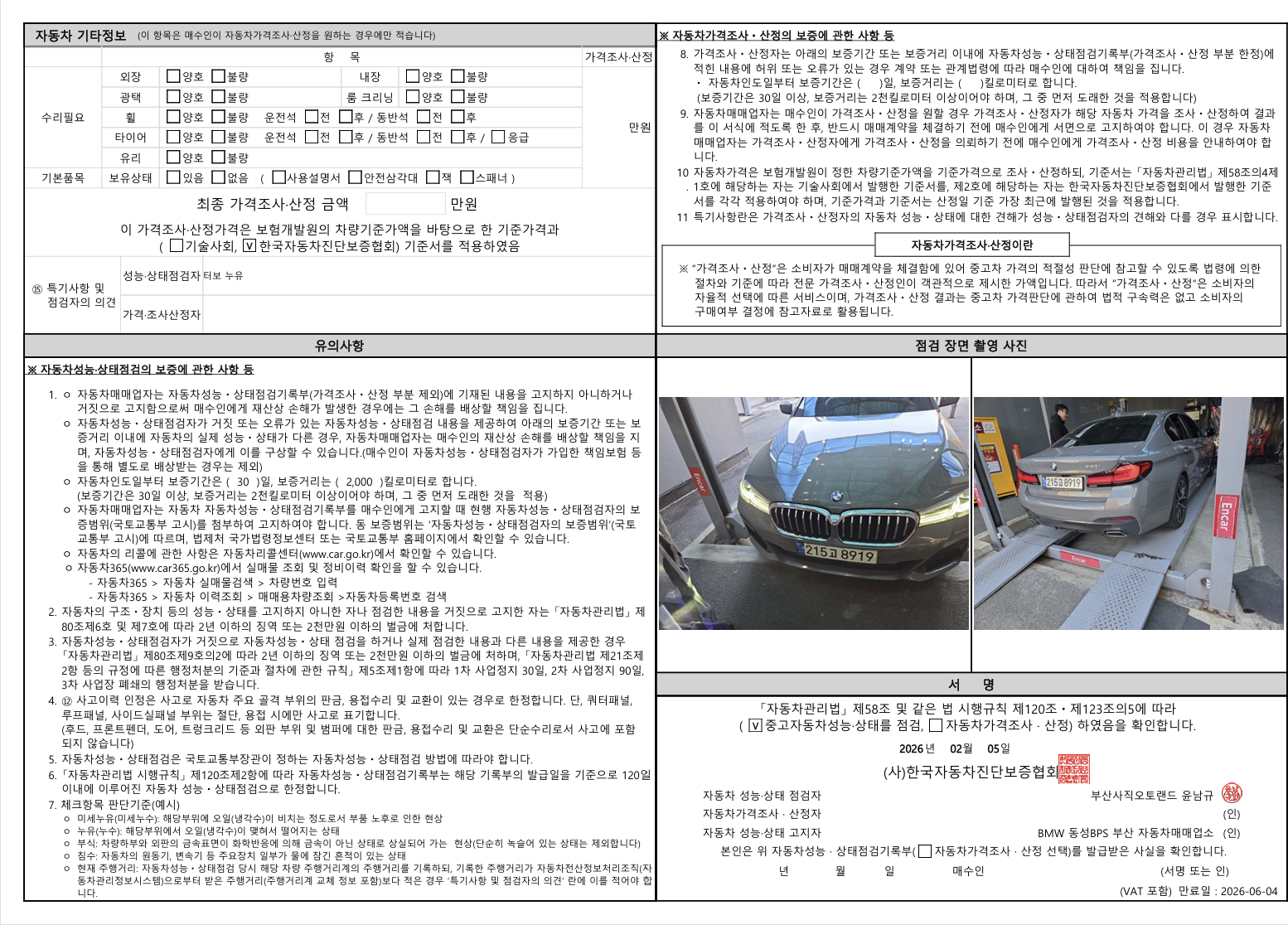 중고자동차 성능 · 상태 점검기록부